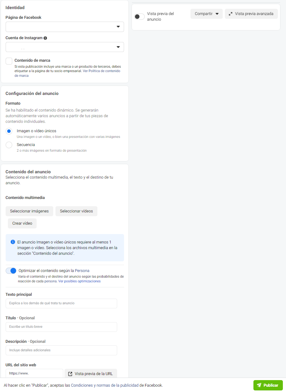 Aquí no hay ningún cambio diferente y, salvo por la elección de «optimizar el contenido según la persona», el resto de variables quedan a nuestra disposición para configurar el anuncio como creamos conveniente.