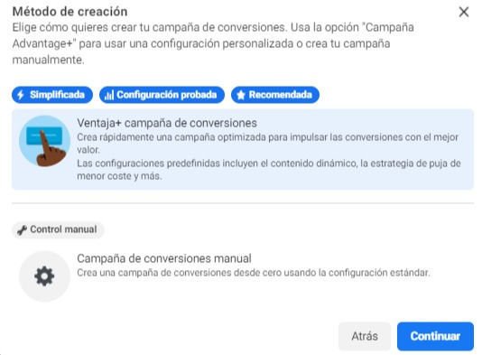 ¡Enhorabuena! Significa que tu cuenta publicitaria ha sido actualizada e introduce una nueva forma de hacer Facebook Ads: Advantage+ Conversion Campaign, o lo que es lo mismo, una versión más simple y fácil de la creación de campañas de forma manual.